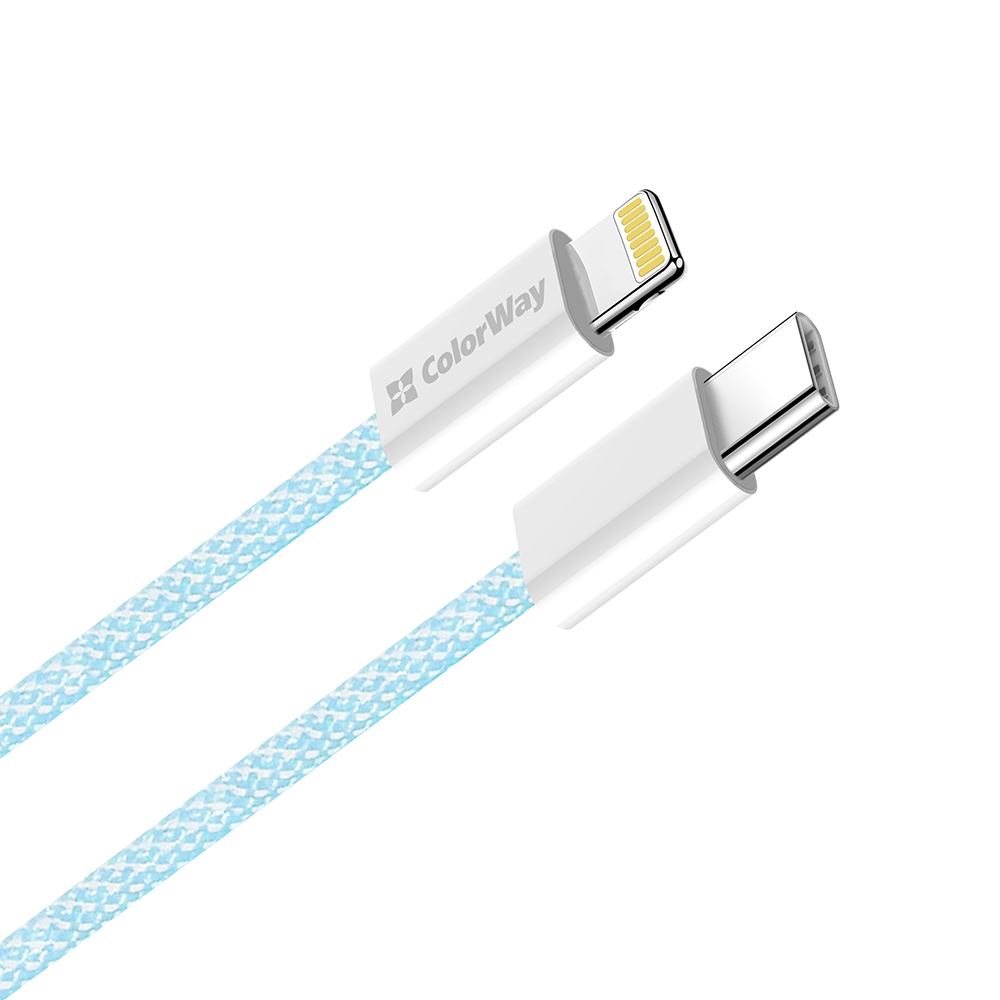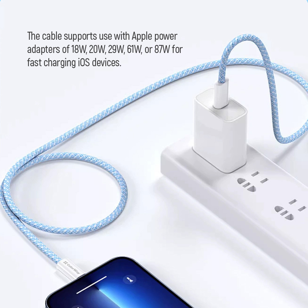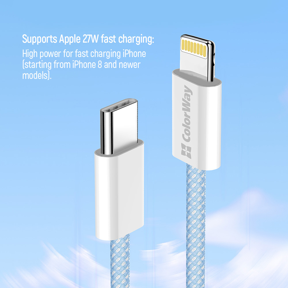 ColorWay USB-C to Lightning sync cable (27W) is a high-tech and reliable accessory for convenient synchronization of Apple devices. It lets you connect an iPhone, iPad, or iPod with a Lightning connector to a USB-C port on a MacBook or a Thunderbolt 3 (USB-C) port on a MacBook Pro. The cable supports use with 18W, 20W, 29W, 61W or 87W Apple power adapters to quickly charge iOS devices. Using Apple USB-C to Lightning enables fast charging for iPhone 8 and newer iPhone models, as well as some iPad Pro models. The durable cable has a unique weave that protects it from wear and tear over long periods of use. The cable length is 1 meter making synchronization convenient. High quality materials ensure the cable's durability. A choice of colors (black, blue, green, grey, pink, purple) allows you to choose a cable that is perfect for your device.