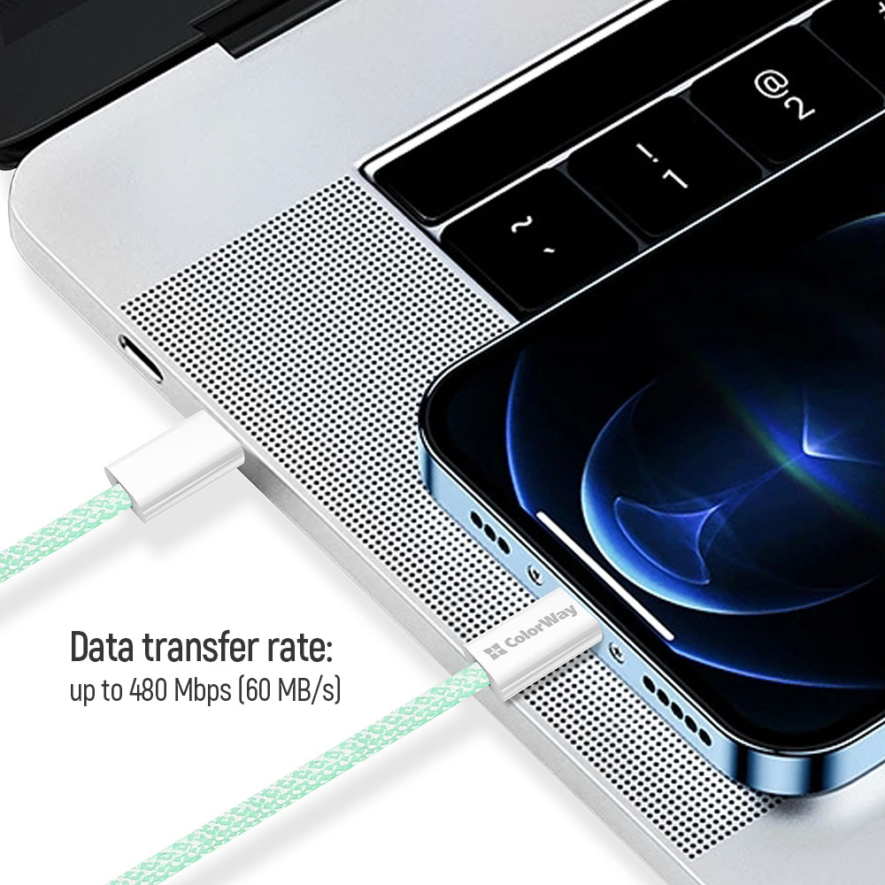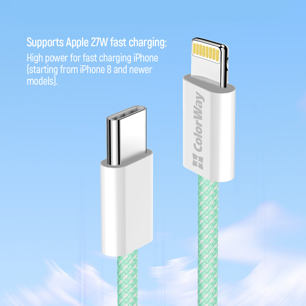 ColorWay USB-C to Lightning sync cable (27W) is a high-tech and reliable accessory for convenient synchronization of Apple devices. It lets you connect an iPhone, iPad, or iPod with a Lightning connector to a USB-C port on a MacBook or a Thunderbolt 3 (USB-C) port on a MacBook Pro. The cable supports use with 18W, 20W, 29W, 61W or 87W Apple power adapters to quickly charge iOS devices. Using Apple USB-C to Lightning enables fast charging for iPhone 8 and newer iPhone models, as well as some iPad Pro models. The durable cable has a unique weave that protects it from wear and tear over long periods of use. The cable length is 1 meter making synchronization convenient. High quality materials ensure the cable's durability. A choice of colors (black, blue, green, grey, pink, purple) allows you to choose a cable that is perfect for your device.