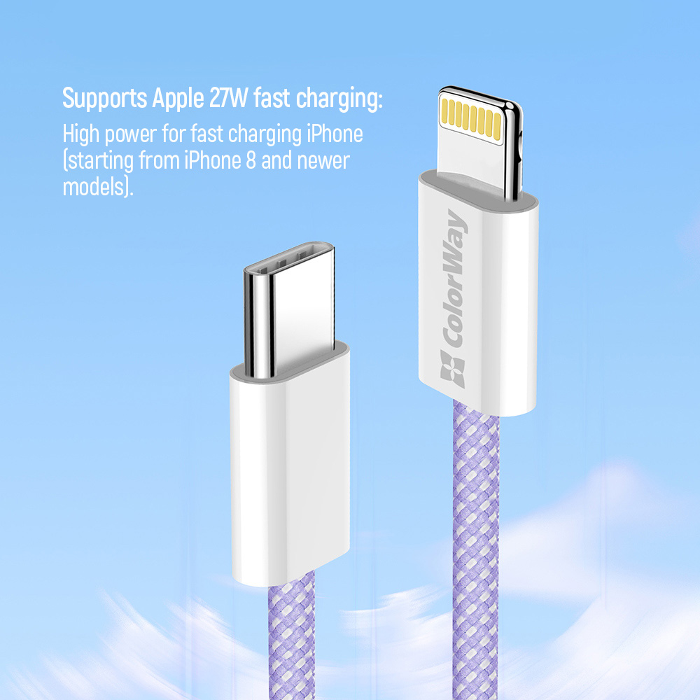 ColorWay USB-C to Lightning sync cable (27W) is a high-tech and reliable accessory for convenient synchronization of Apple devices. It lets you connect an iPhone, iPad, or iPod with a Lightning connector to a USB-C port on a MacBook or a Thunderbolt 3 (USB-C) port on a MacBook Pro. The cable supports use with 18W, 20W, 29W, 61W or 87W Apple power adapters to quickly charge iOS devices. Using Apple USB-C to Lightning enables fast charging for iPhone 8 and newer iPhone models, as well as some iPad Pro models. The durable cable has a unique weave that protects it from wear and tear over long periods of use. The cable length is 1 meter making synchronization convenient. High quality materials ensure the cable's durability. A choice of colors (black, blue, green, grey, pink, purple) allows you to choose a cable that is perfect for your device.