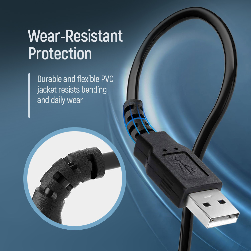 This cable supports stable data transfer speeds of up to 480 Mbps in compliance with the USB 2.0 standard, ensuring fast file exchange, video, audio, and other data transmission without delays. The copper conductor guarantees high-quality signal transmission without loss, while the durable PVC jacket protects the cable from mechanical damage, bending, and wear, ensuring long-lasting performance.