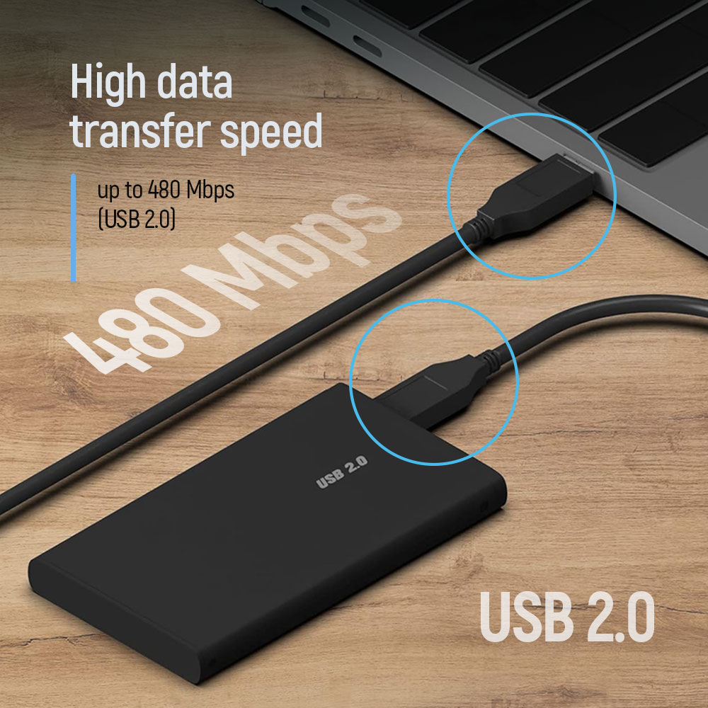 - Speed: up to 480 Mbps (USB 2.0).