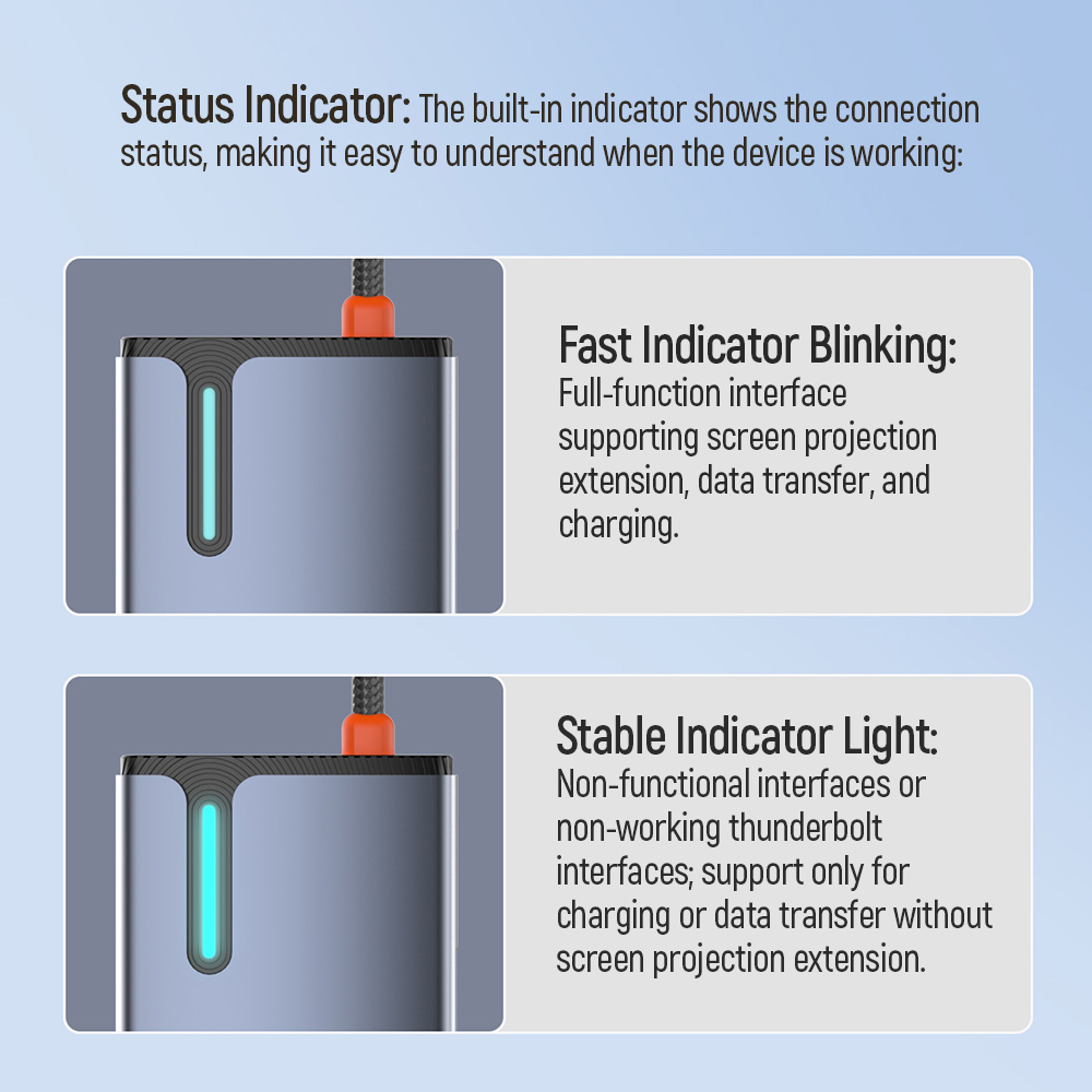 - Stable indicator light: Non-functional interfaces or thunderbolt interfaces do not work; Support only charging or data transfer without expanding screen projection.