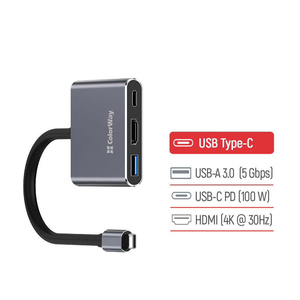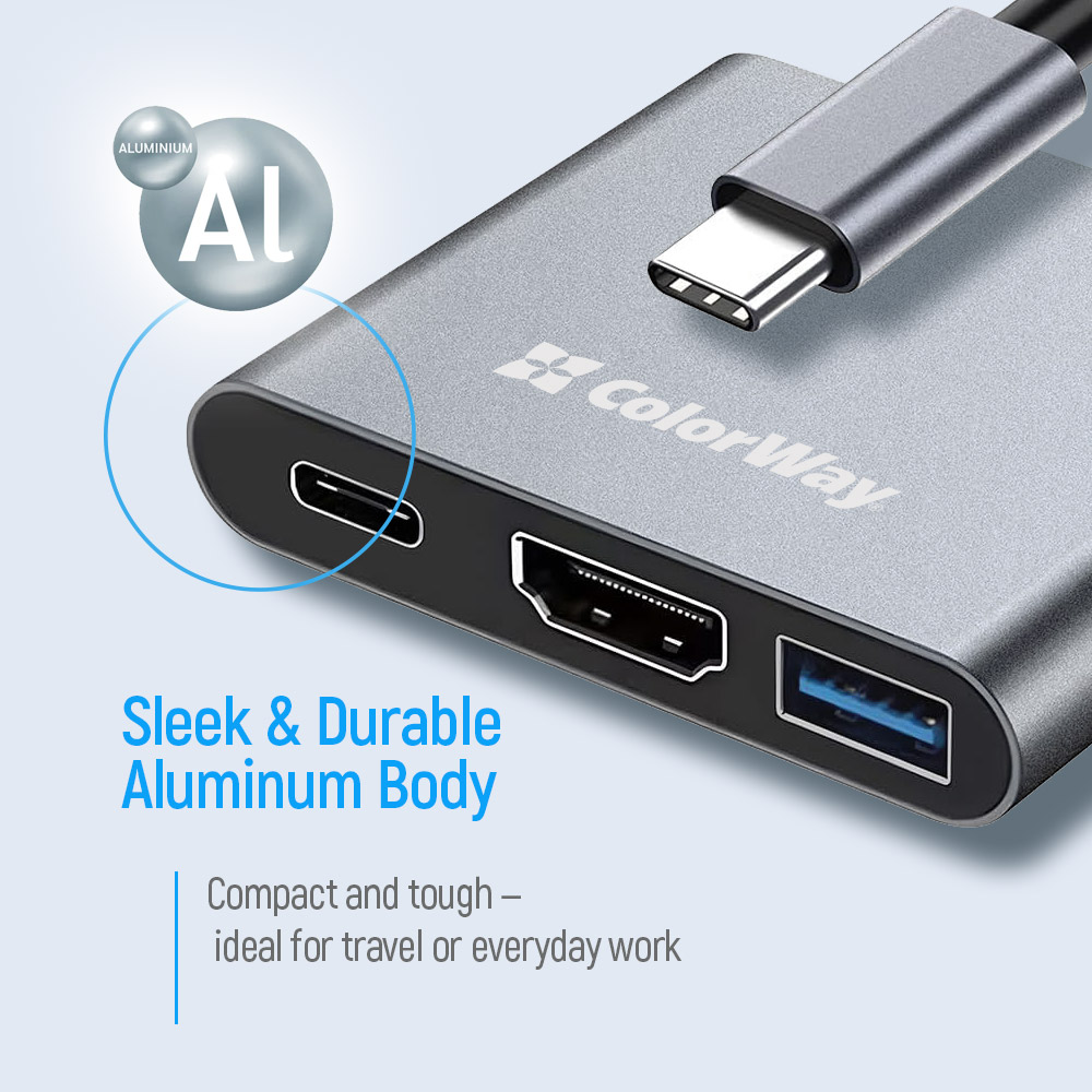 USB Hub (Docking Station) ColorWay 3-in-1 USB-C PD 100W / USB 3.0 / HDMI 4K- the compact and multifunctional ColorWay 3-in-1 docking station is designed to expand the capabilities of your laptop, PC, smartphone, or tablet with OTG support. It allows you to charge devices, transfer data, and output 4K video — all through a single USB-C port.