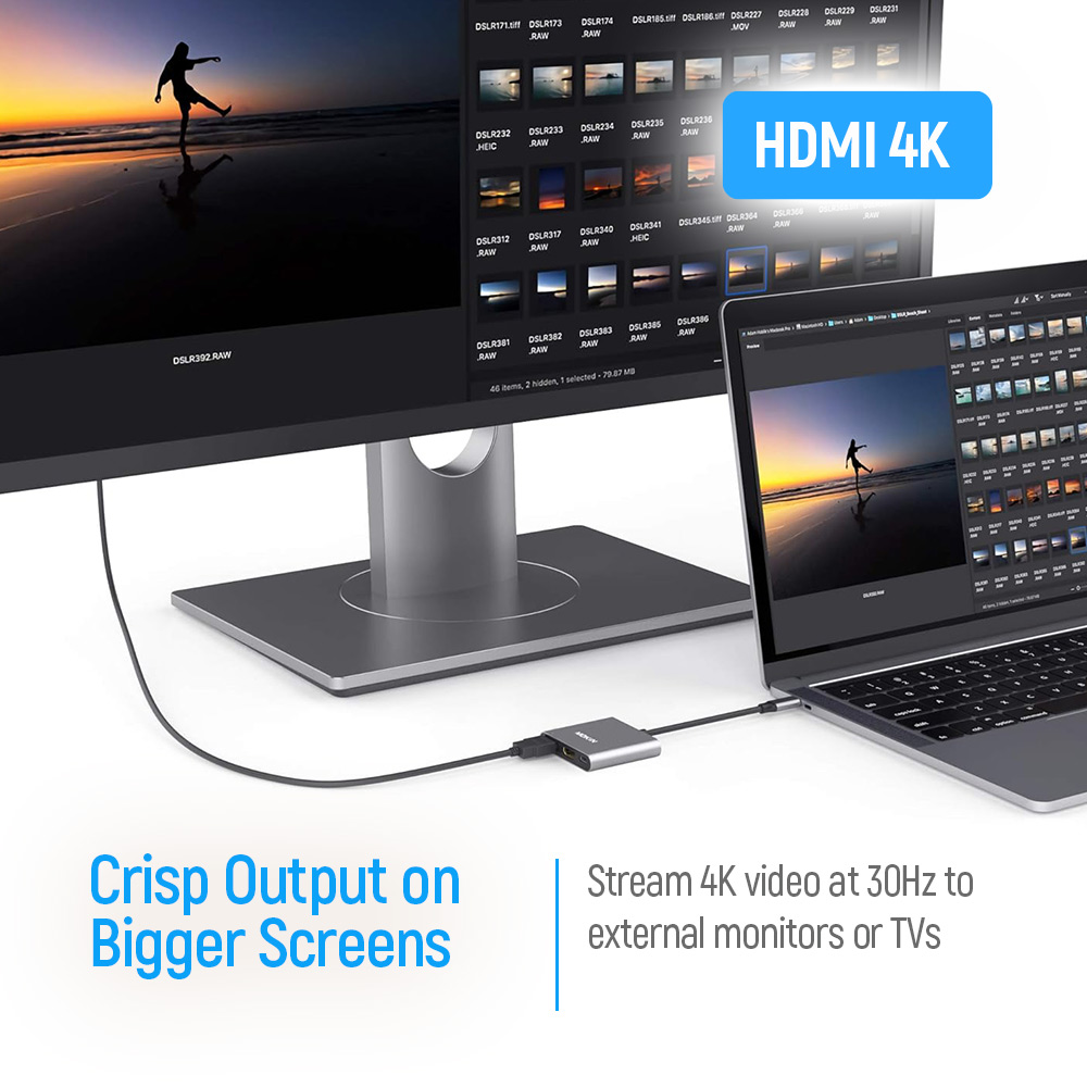 - Output ports: 1 x USB-C PD (up to 100W), 1 x HDMI (4K @ 30Hz), 1 x USB-A 3.0 (up to 5Gbps).