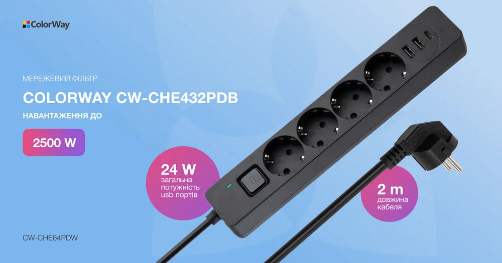 Power soсket СolorWay 4 power sockets/3USB (2USB-A + 1 TYPE-C) (24W) Black 5M (CW-CHE435PDB)