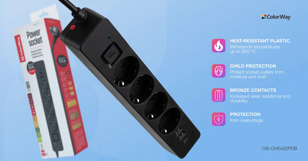 The socket contacts are made of bronze, which is quite elastic and wear-resistant. The case is made of heat-resistant plastic and can withstand temperatures up to 750 °C. The automatic overload protection in the surge protector ensures the safety of electrical devices by preventing excessive current.