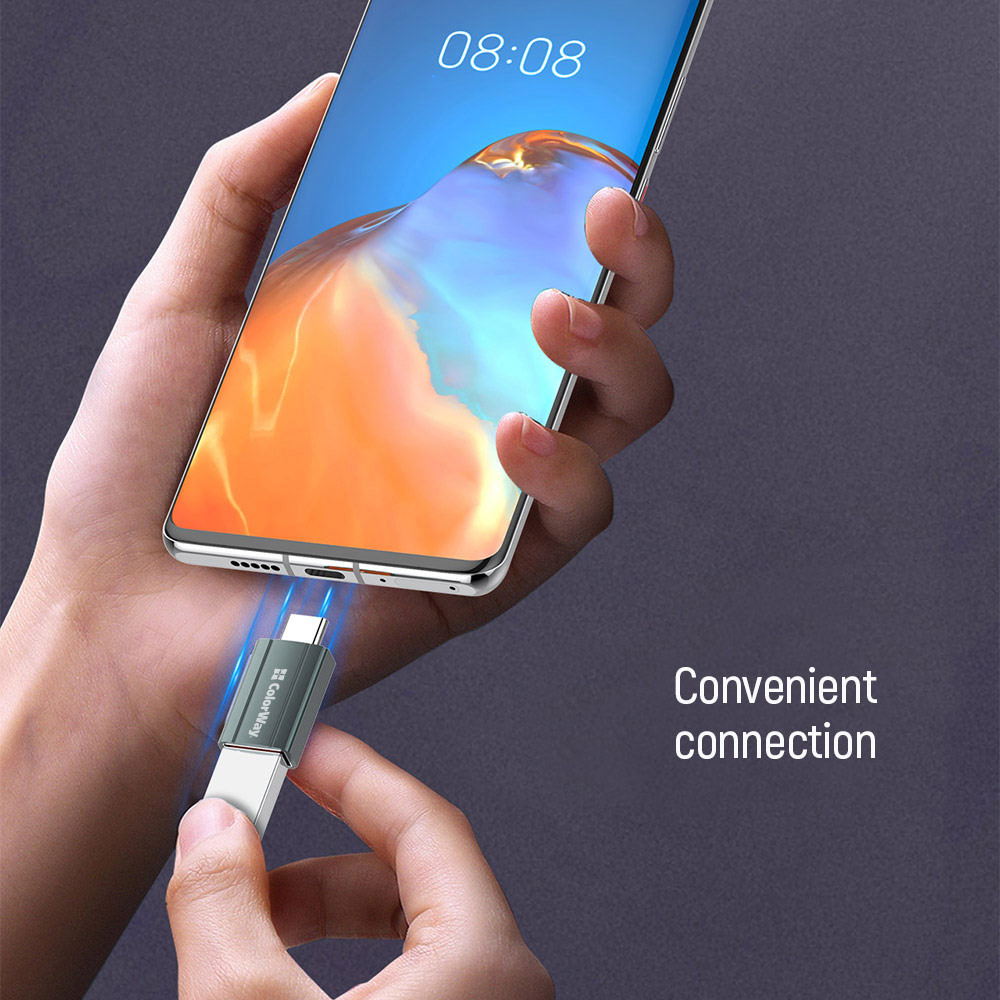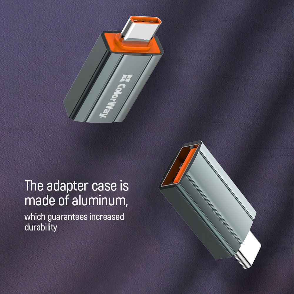 The Colorway USB-A to Type-C adapter is a miniature adapter that allows you to charge and synchronize mobile gadgets with PCs or laptops that have a USB Type-C interface. This adapter will also be a great solution for connecting various peripheral equipment or media with the interface USB-A. The adapter has miniature dimensions, which ensures convenient storage. The body of the adapter is made of aluminum, and although the dimensions are not large, they do not cause difficulties in connecting to a PC or laptop. The adapter allows you to connect devices with a USB-A connector to a laptop, PC or charger with a USB-C interface. The adapter supports a current of up to 3 A, which guarantees fast charging. Also, this accessory allows you to exchange data between two devices at high speed.
