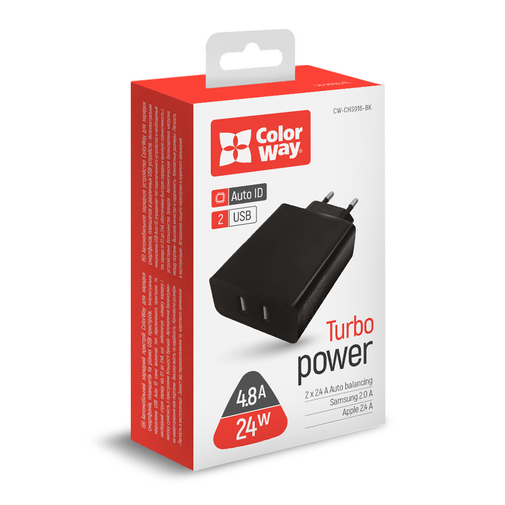 AC Charger ColorWay 2USB AUTO ID 4.8A (24W) black (CW-CHS016-BK)