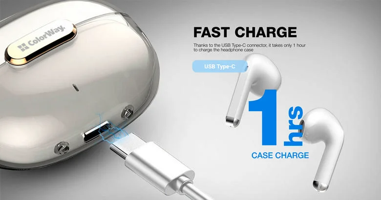 Don't waste time waiting - the ColorWay Slim TWS-2 Earbuds provide fast charging with an advanced USB Type-C connector. In just 1 hour, you'll have a fully charged case and ready to listen to music.