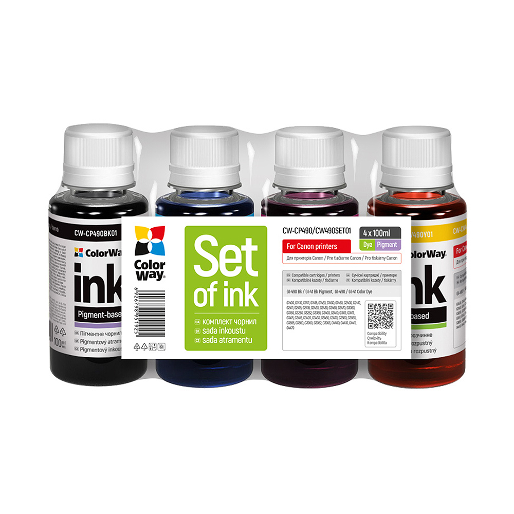Set of ink ColorWay for Canon CP490/CW490 BK/C/M/Y Dye-based 4 x 100 ml (CW-CP490/CW490SET01)