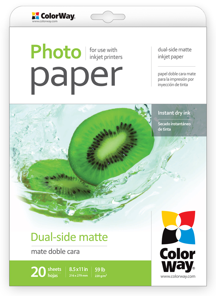 Dual-side matte ColorWay Photo Paper® for inkjet printing. Paper has a high brightness and flat matte surface on both sides. Paper provides a stark contrast without glare and won't show fingerprints. Paper is ideal for printing of photorealistic handouts, flyers, promotional cards, etc. It has a wide color spectrum and good ink absorption. Store in a cool, dry place and keep away from direct sunlight. Storage temperature from 40°F to 80°F. Best if used within 5 years from manufacturing date. Date of production is on package. Paper does not contain any harmful chemicals. Pictures should be stored in photo albums or picture frames to maintain quality.This paper model is intended only for inkjet printing and personal use.