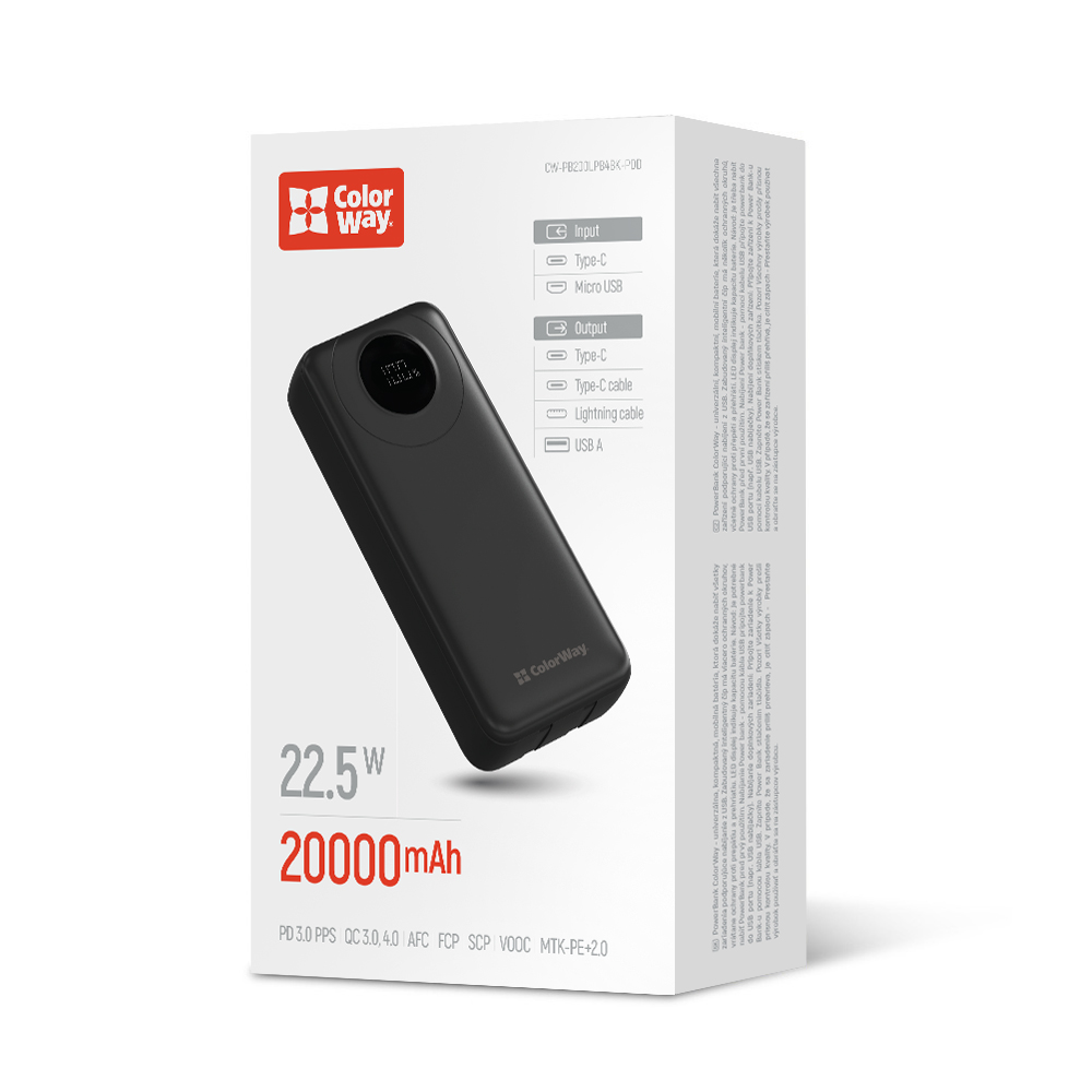 The ColorWay power bank with a capacity of 20,000 mAh is a reliable and functional gadget equipped with a high-quality lithium-polymer battery. It features multiple protection levels against short circuits and voltage surges, ensuring safe use with your mobile devices. Supporting modern fast-charging technologies such as Power Delivery 3.0, Quick Charge 2.0, 3.0, 4.0, Huawei Fast Charge, and Samsung Fast Charge, this device provides a charging power of up to 22.5 W. The power bank has two output ports (USB-A and Type-C), along with two built-in cables (Type-C and Lightning), allowing up to four devices to be connected simultaneously. Fast charging of the power bank itself via the Type-C port is a convenient solution for one-cable use. The LED display shows the charge level, and the compact design makes it easy to carry – perfect for travel and fitting comfortably in a bag. This is a universal accessory for charging various devices