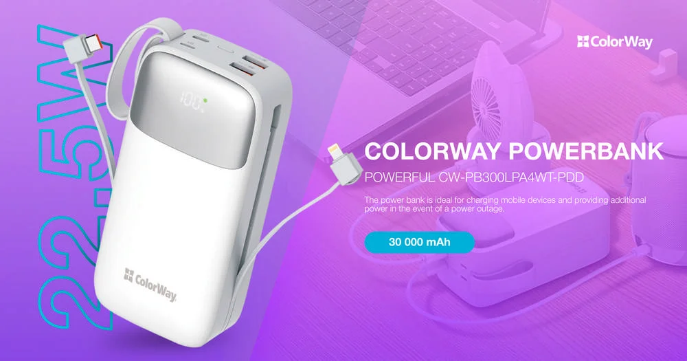 The 30,000mAh external mobile battery from ColorWay is the ideal solution for reliable power for a variety of devices. With a power output of up to 22.5W, it is ideal for charging mobile devices and providing additional power in the event of a power outage.