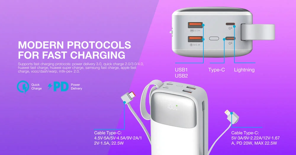 Support for a wide range of modern fast charging protocols, such as Power Delivery 3.0, Quick Charge 2.0 & 3.0 & 4.0, Huawei Fast Charge, Huawei Super Charge, Samsung Fast Charge, Apple Fast Charge, VOOC/DASH/WARP, MTK-PE+ 2.0, ensures that your devices are charged efficiently and quickly