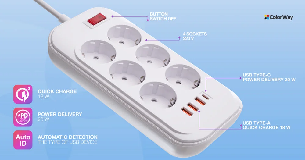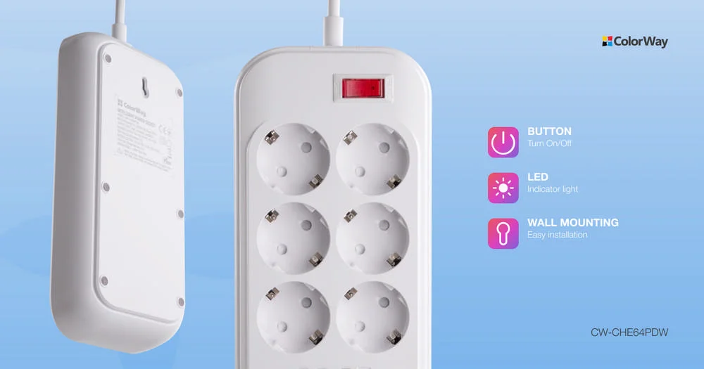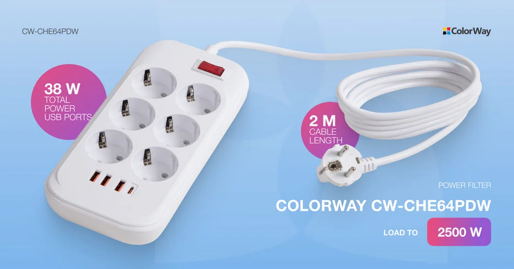 Power soсket СolorWay 6 power sockets/4USB (Type-C PD20W + 3USB QC3.0) (38W) White 2M (CW-CHE64PDW)