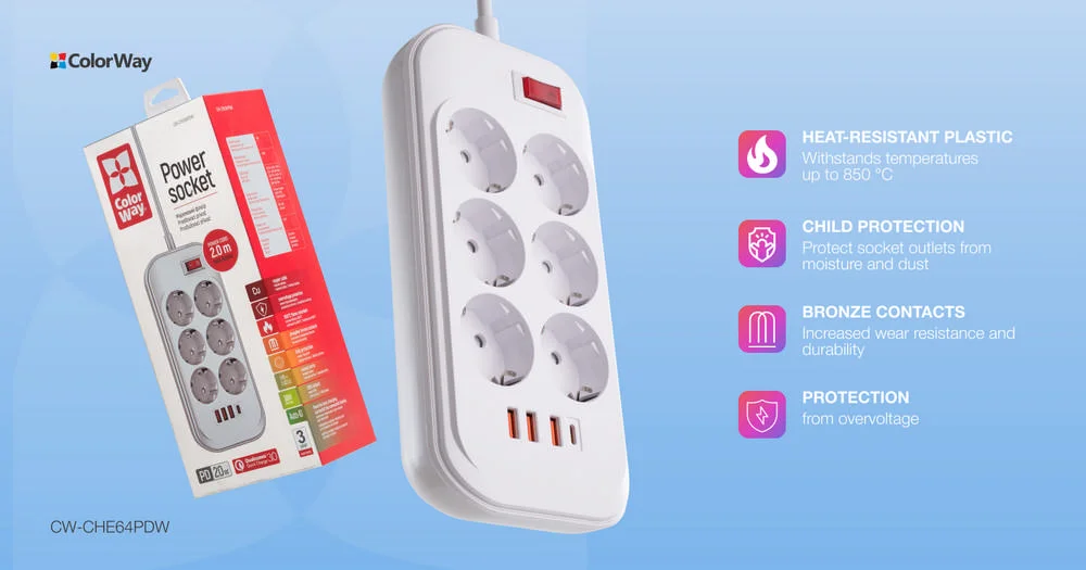 The socket contacts are made of bronze, which is quite elastic and wear-resistant. The body is made of heat-resistant plastic and can withstand temperatures up to 850 °C. The sockets are equipped with child-proof curtains. The extension cord also has a surge protector, which makes it safer to use.