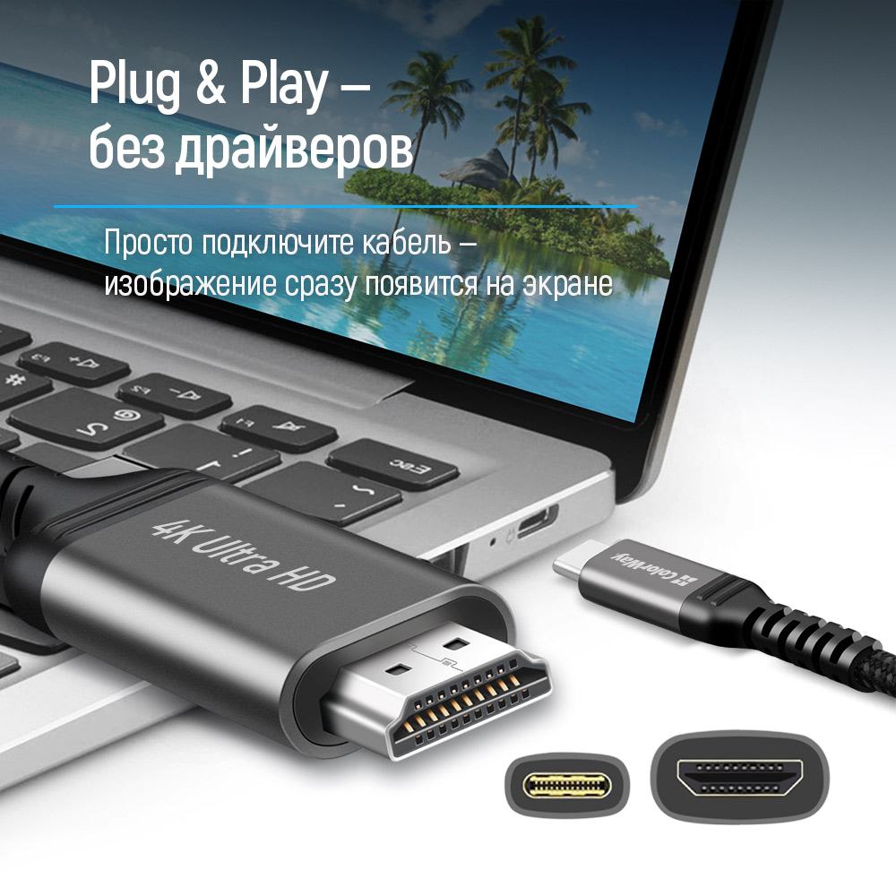 ColorWay USB-C to HDMI — надежный кабель для подключения ноутбуков, планшетов или смартфонов с портом USB-C к мониторам, телевизорам или проекторам с HDMI-входом. Идеален для просмотра фильмов в высоком качестве, трансляции презентаций, работы или игр на большом экране.