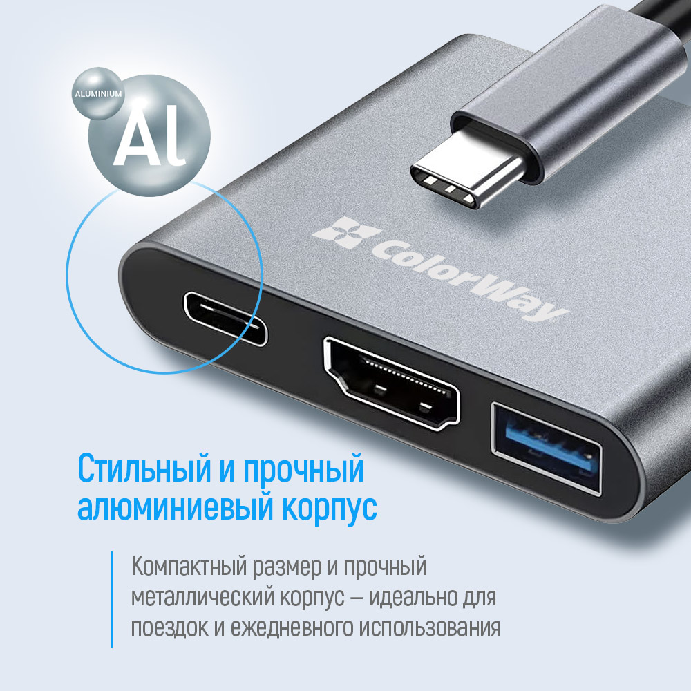 USB хаб (док-станция) СolorWay USB-C 3-в-1 Type C PD 100W/USB3.0/HDMI 4К (CW-HUB08)