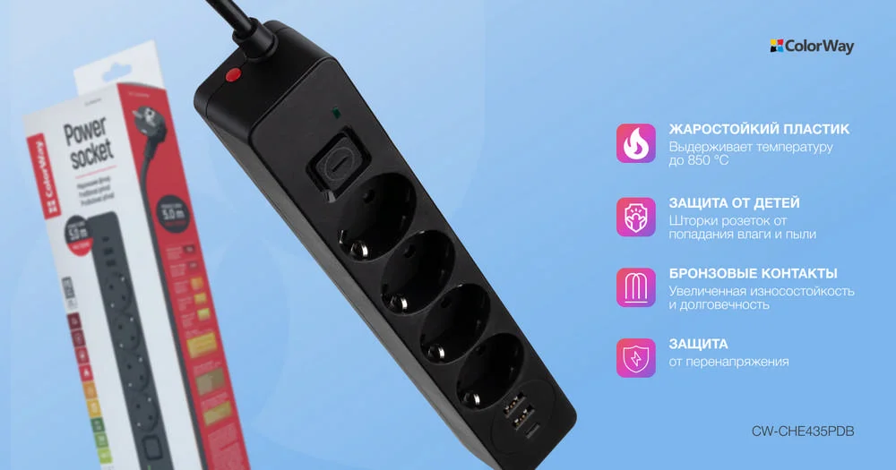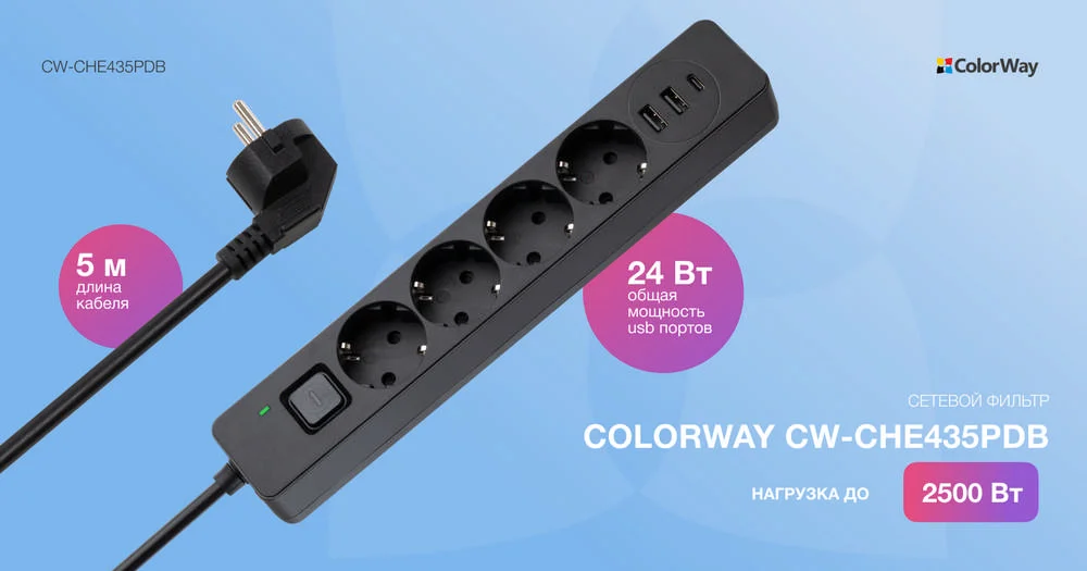Сетевой фильтр-удлинитель СolorWay 4 розетки/3USB (2USB-A + 1 TYPE-C) (24W) Black 5M (CW-CHE435PDB)