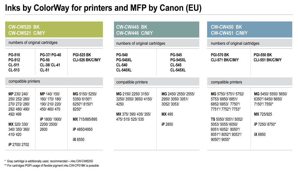 На данный момент новые чернила подходят для самых популярных и востребованных на рынке недорогой печати аппаратов Canon. Весь список совместимости можно посмотреть ниже.