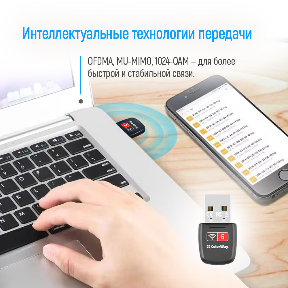 ColorWay Wi-Fi 6 — компактный адаптер нового поколения для быстрого и стабильного подключения к беспроводному Интернету. Благодаря поддержке стандарта Wi-Fi 6 (802.11ax), адаптер обеспечивает повышенную эффективность, стабильность сигнала и высокий уровень безопасности по сравнению с предыдущими версиями. Даже в загруженных сетях вы получаете плавное и надёжное подключение.