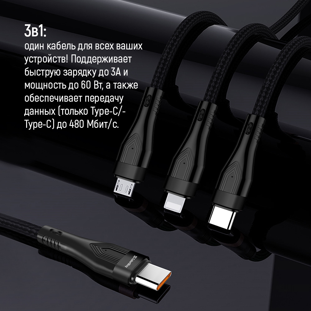 Кабель Colorway Type-C - 3в1 (Lightning+MicroUSB+Type-C) 3.0A (PD60W data) 1.2 черный (CW-CBPDU3060-BK)