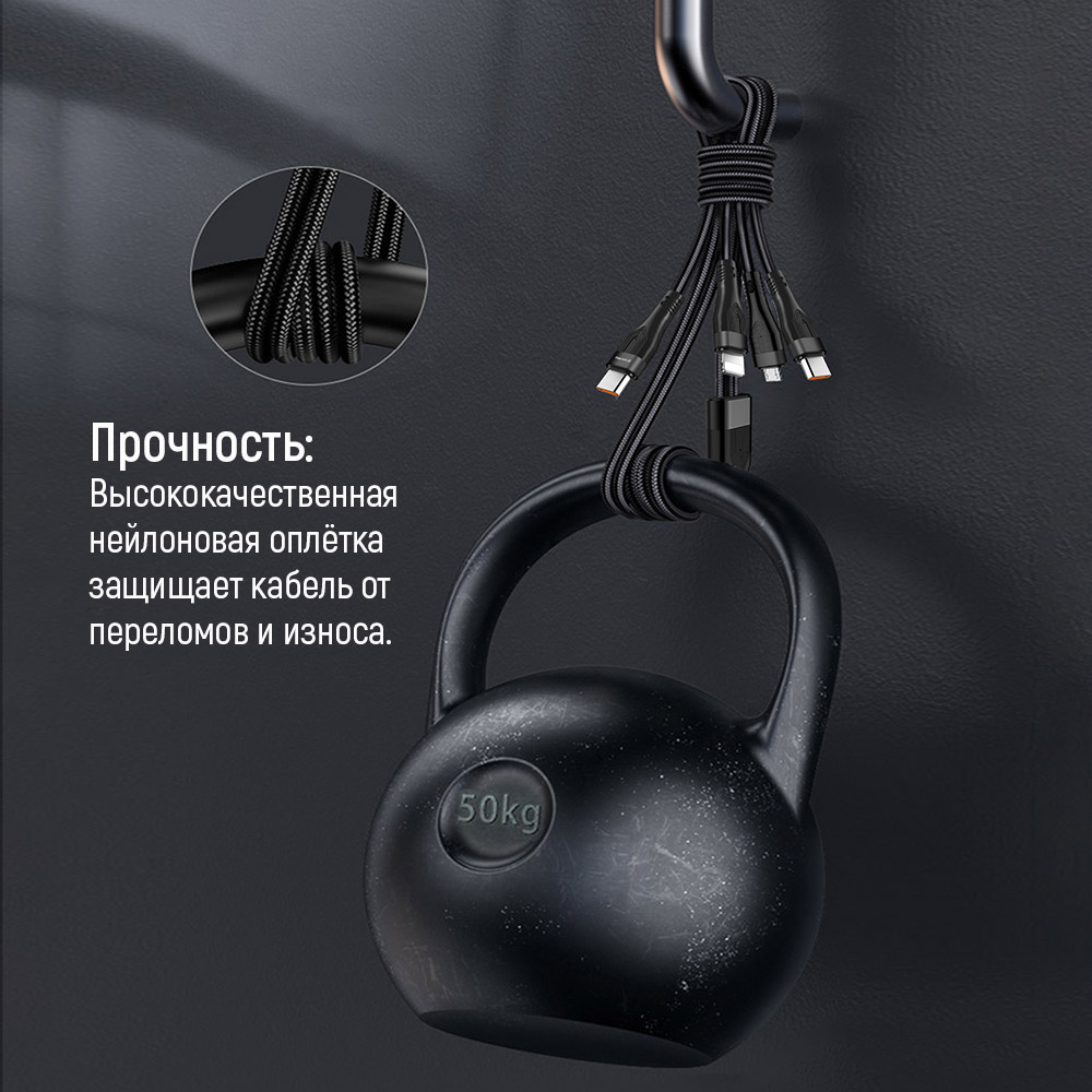 - Универсальность: Кабель позволяет одновременно заряжать три устройства с разными разъемами, включая Lightning, Micro USB и Type-C.