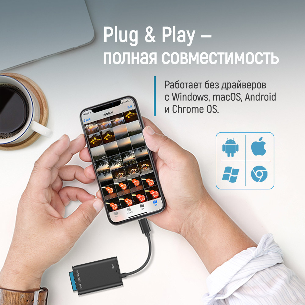 Благодаря формату Plug & Play устройство совместимо с Windows, macOS, Android и Chrome OS и не требует установки драйверов. Выдвижной слот защищает карты от случайного извлечения, а компактный размер позволяет всегда иметь кардридер под рукой.