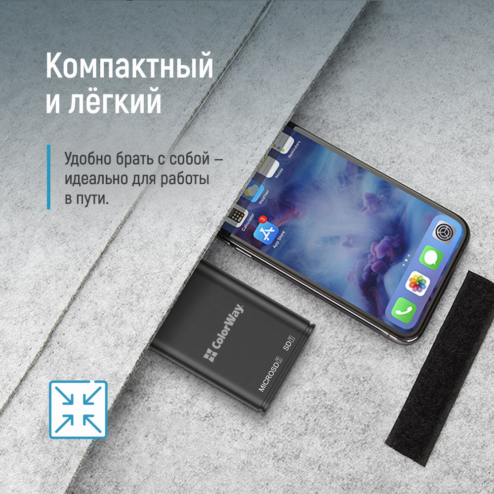 Предназначен для считывания карт памяти SD и microSD (TF), а также оснащён дополнительным портом USB-A 3.0 со скоростью передачи данных до 5 Гбит/с. Подключается к ноутбукам, ПК, смартфонам и планшетам с разъёмом USB-C и поддержкой OTG.