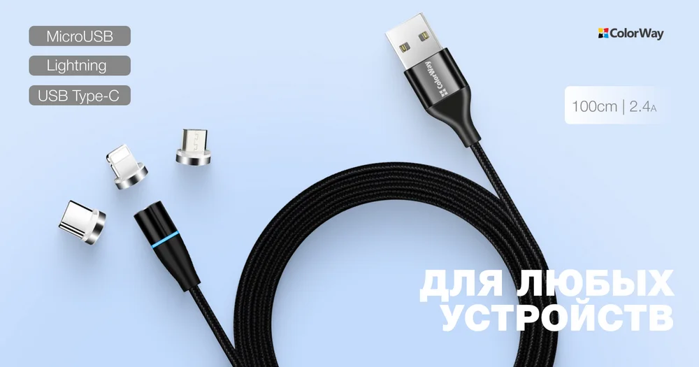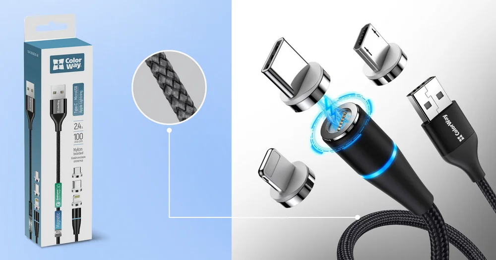 Магнитный кабель 3в1 ColorWay - это универсальное решение для синхронизации и зарядки ваших устройств. Благодаря трем разъемам - Lightning, microUSB и Type-C, вы можете использовать один кабель для зарядки телефона, планшета или любого другого гаджета. Это идеальный аксессуар для тех, кто ищет удобство и многофункциональность в одном кабеле