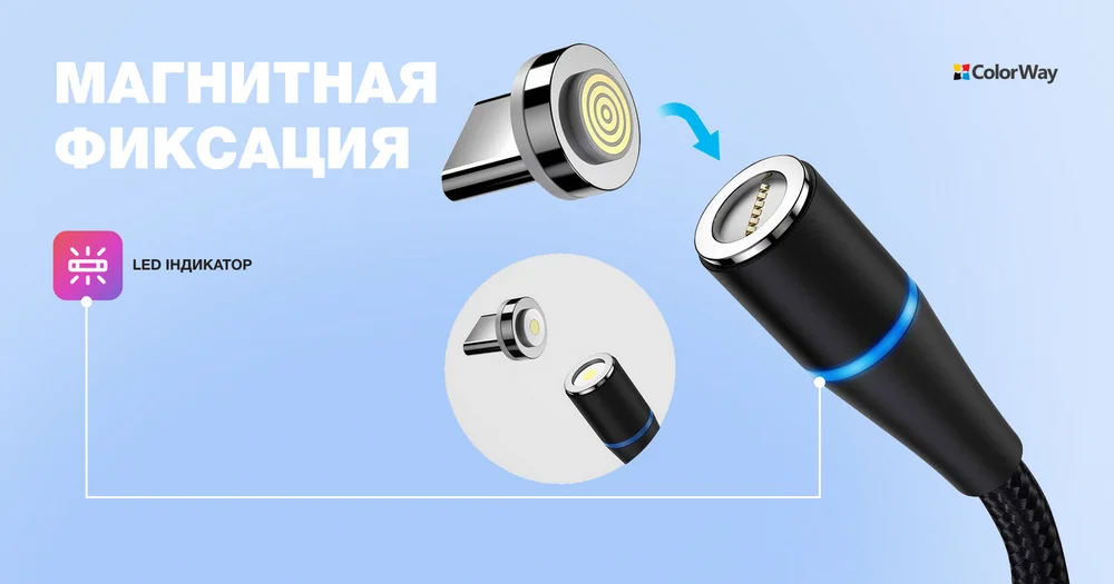 Магнитный кабель ColorWay оснащен надежным магнитом, что гарантирует стабильное соединение с устройством. Его функция ротации на 360 градусов обеспечивает удобство пользования, независимо от положения телефона. Кроме того, Led индикатор позволяет легко найти кабель в темноте, что добавляет еще больше комфорта при зарядке ночью.
