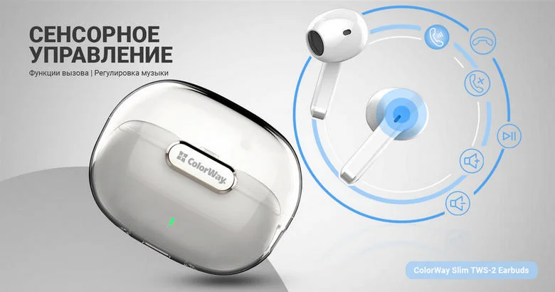 Слушайте музыку и принимайте звонки с легкостью благодаря интуитивно понятному сенсорному управлению наушниками СоІогԜау Slim TWS-2 Earbuds. Удобство использования достигается благодаря возможности управления музыкой и звонками непосредственно на наушниках.