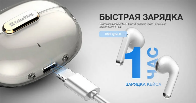 Не теряйте времени на ожидание — наушники-гарнитура СоІогԜау Slim TWS-2 Earbuds обеспечивают быструю зарядку с помощью современного разъема USB Type-C. Всего за 1 час вы получите полностью заряженный кейс и готовность к прослушиванию музыки.