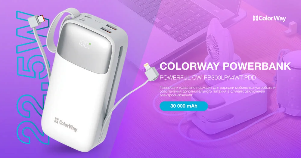 Внешний мобильный аккумулятор от ColorWay с емкостью 30000mAh представляет собой идеальное решение для надежного питания различных устройств. С мощностью до 22.5Вт, он идеально подходит для зарядки мобильных устройств и обеспечения дополнительного питания в случаях отключения электроснабжения.
