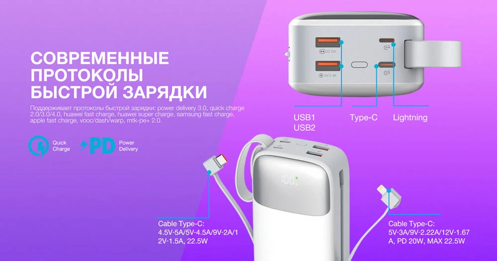 | Выходы: | USB 1: 4.5V⎓5A/5V⎓4.5A/9V⎓2A/12V⎓1.5A, 22.5W, USB 2: 5V⎓2.4A, 12W, Cable Type-C: 4.5V⎓5A/5V⎓4.5A/9V⎓2A/12V⎓1.5A, 22.5W, Cable Lightning: 5V⎓3A/9V⎓2.22A/12V⎓1.67A, PD 20W, Total Max 22.5W; |