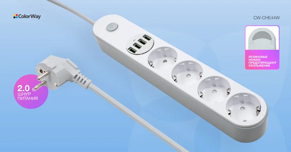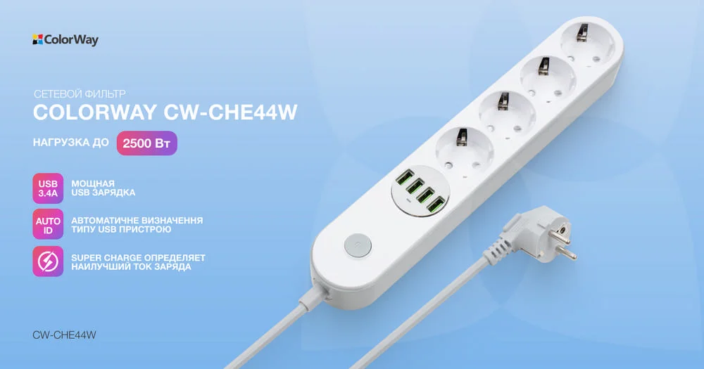 Сетевой фильтр-удлинитель СolorWay 4 розетки/4USB (CW-CHE44W)