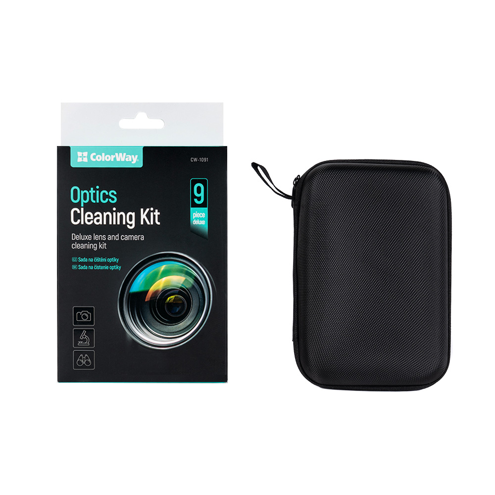 Комплект для очищення оптики ColorWay. Цей 9-компонентний набір для чищення об’єктивів і фотокамери Deluxe містить усі основні елементи, необхідні для належного обслуговування та догляду за мікроскопом, цифровою камерою, об’єктивами та аксесуарами.