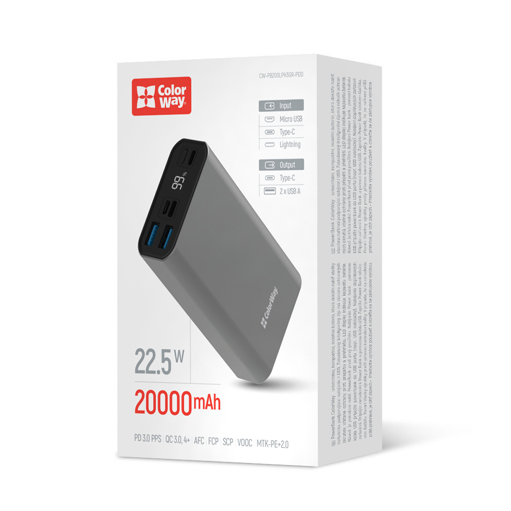 УМБ ColorWay повербанк 20 000 mAh Full (USB QC3.0 + USB-C Power Delivery 22.5W) Gray (CW-PB200LPH3GR-PDD)