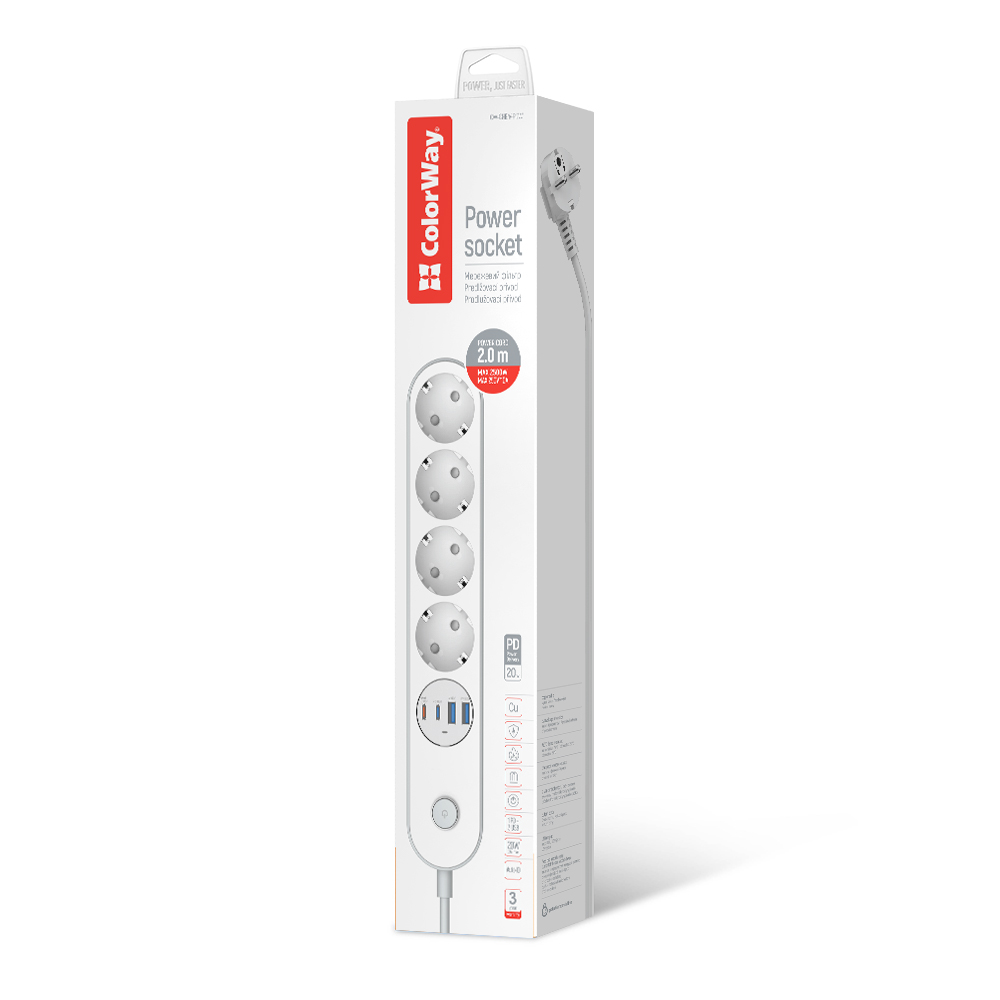 Мережевий фільтр-подовжувач ColorWay 4 розетки/4 USB (2×USB-C PD 20 Вт + 2×USB-A QC 3.0), білий, кабель 2 м— це сучасний мережевий фільтр-подовжувач, який поєднує в одному корпусі повноцінні розетки та швидку USB-зарядку. Він створений для комфортного підключення побутової й офісної техніки та одночасного заряджання кількох мобільних пристроїв без використання додаткових адаптерів.