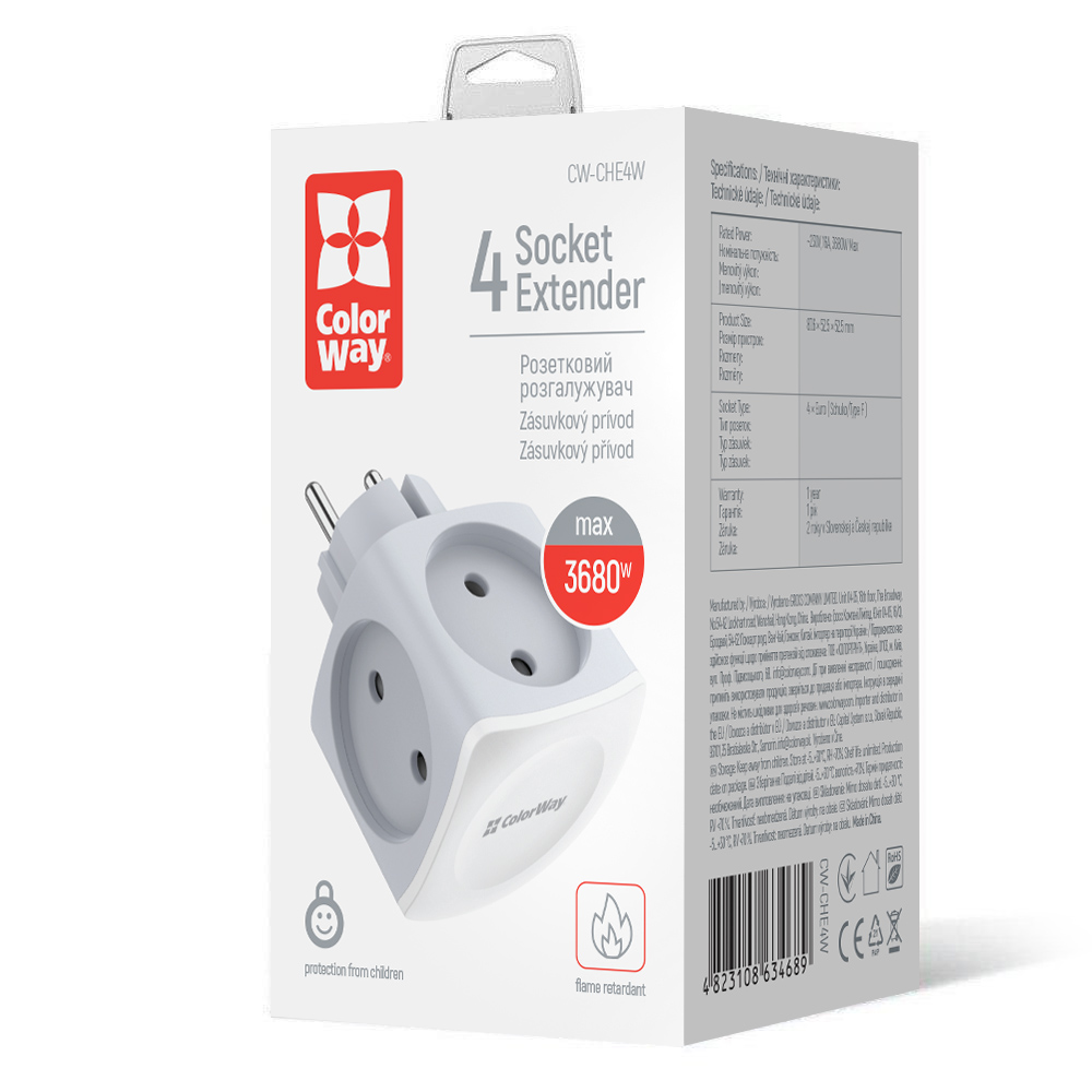 Електричний розгалужувач ColorWay дозволяє перетворити одну настінну розетку на чотири повноцінні євро-розетки, забезпечуючи зручне підключення кількох електроприладів одночасно. Завдяки продуманому розташуванню розеток по чотирьох сторонах корпусу навіть габаритні адаптери не перекривають сусідні виходи, що робить пристрій практичним для щоденного використання вдома, в офісі або на кухні.