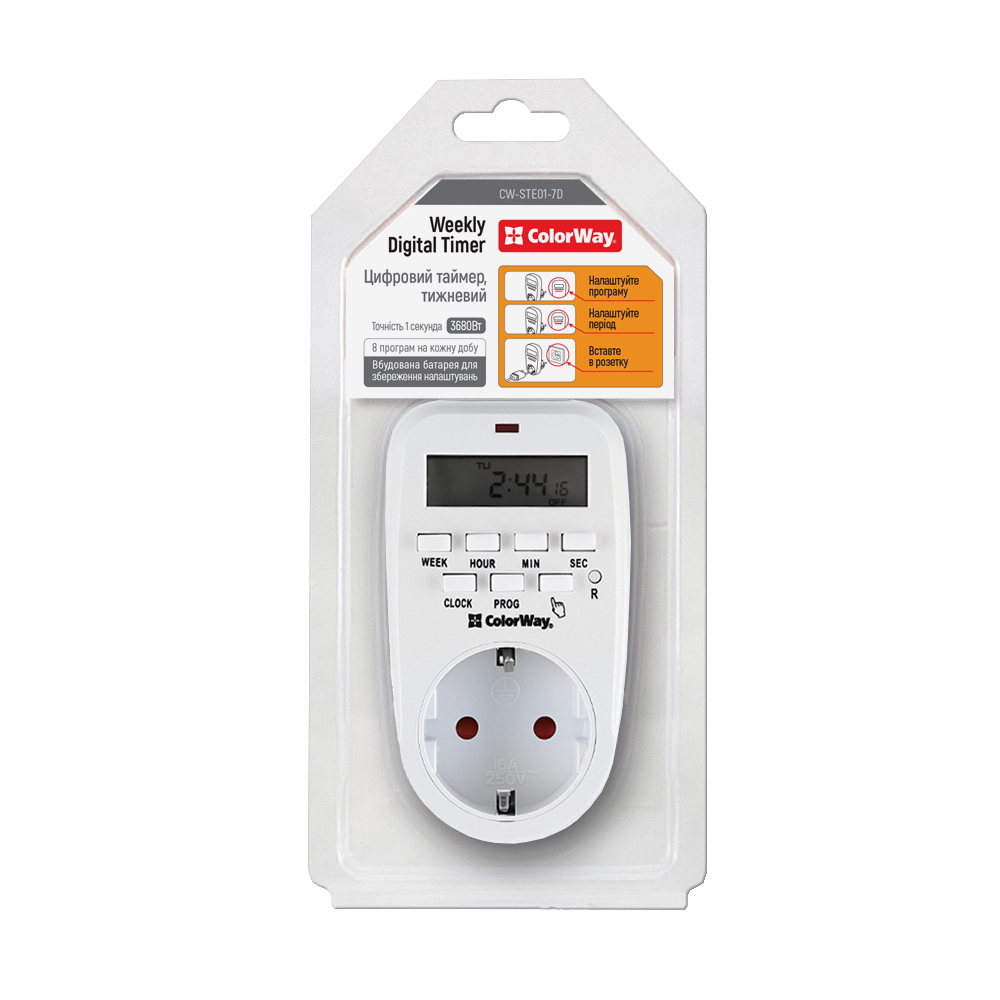 Ця електронна таймер-розетка обладнана цифровим таймером, що дозволяє автоматично вмикати та вимикати живлення у визначені інтервали часу. Модель відрізняється якісним виконанням, докладною інструкцією користувача та великим РК-дисплеєм, що робить налаштування та управління простими та зручними. Таймер-розетка дає змогу контролювати роботу різних побутових пристроїв за розкладом, без необхідності вашого втручання — достатньо лише задати потрібну послідовність дій. Вона чудово підходить для автоматизації освітлення та управління електроприладами як у житлових, так і в офісних приміщеннях.