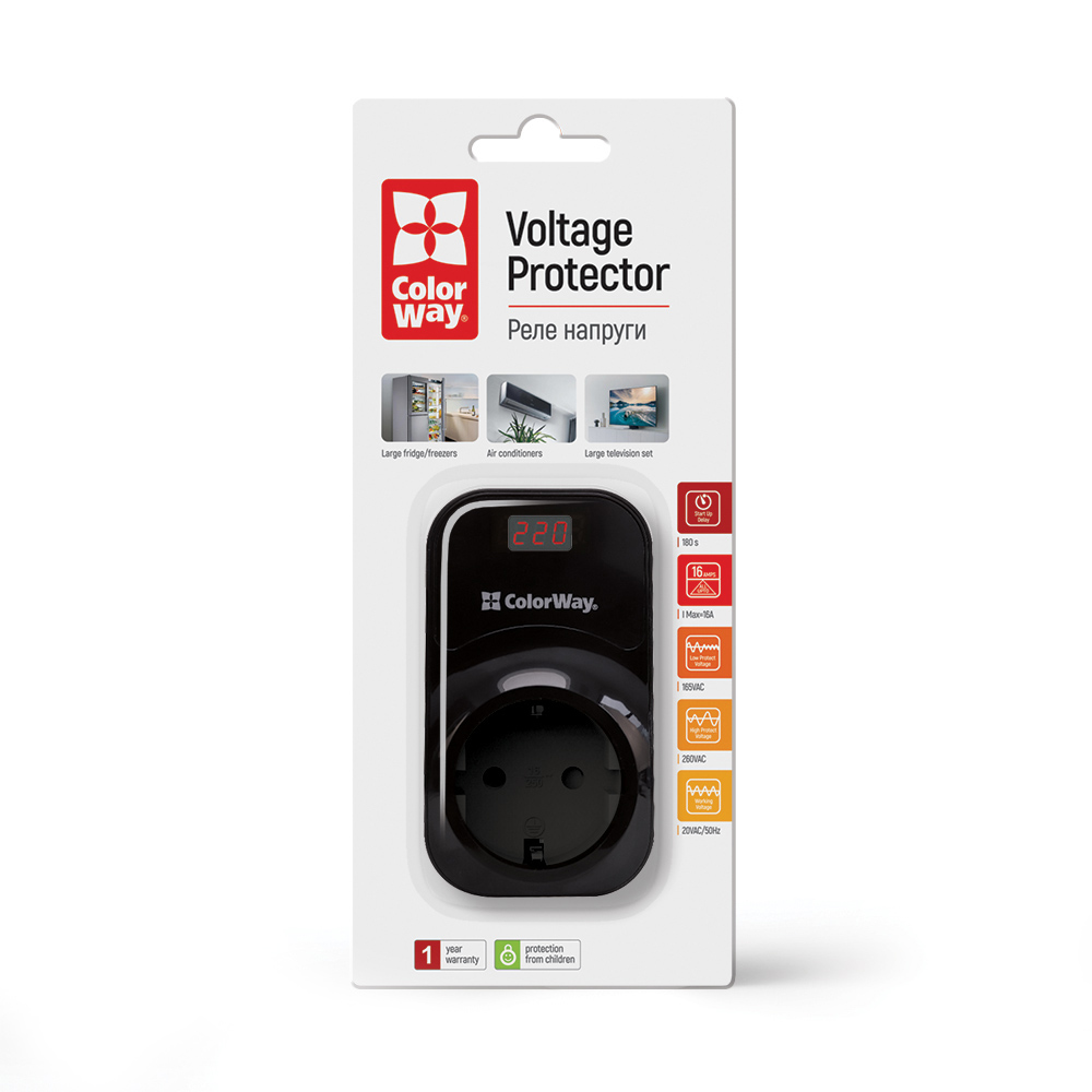 Реле напруги Сolorway – спеціальний пристрій захисту від перепадів напруги у мережі. Реле в режимі реального часу аналізує напругу мережі та автоматично вимикає підключену техніку від живлення при виході показників напруги на критичні позначки. Після повернення напруги у встановлений діапазон навантаження - автоматично вмикається з невеликою затримкою. Має дисплей з індикацією напруги та гнучкі налаштування нижнього та верхнього порогу відключення за напругою, а також налаштування часу затримки увімкнення обладнання від 5 до 999 секунд. Затримка під час увімкнення необхідна для обладнання, якому неприйнятні короткострокові відключення (холодильники, морозильні камери, кондиціонери).