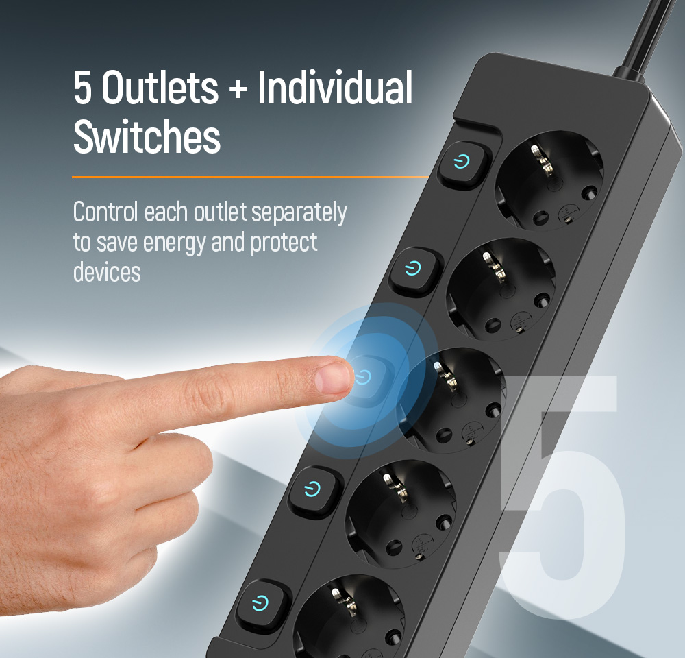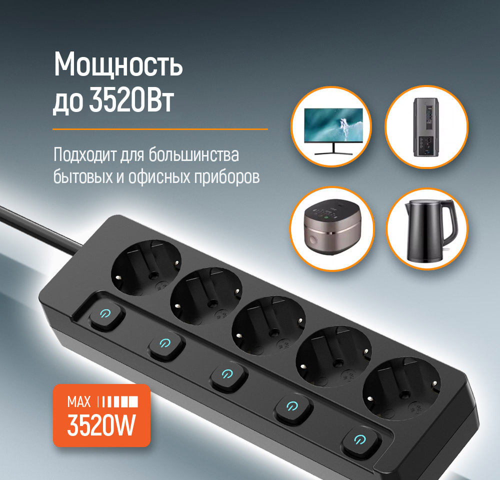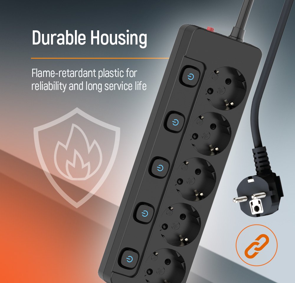 Назва: | Мережевий фільтр СolorWay 5 розеток (вимикач на кожну розетку)/5M чорний black |