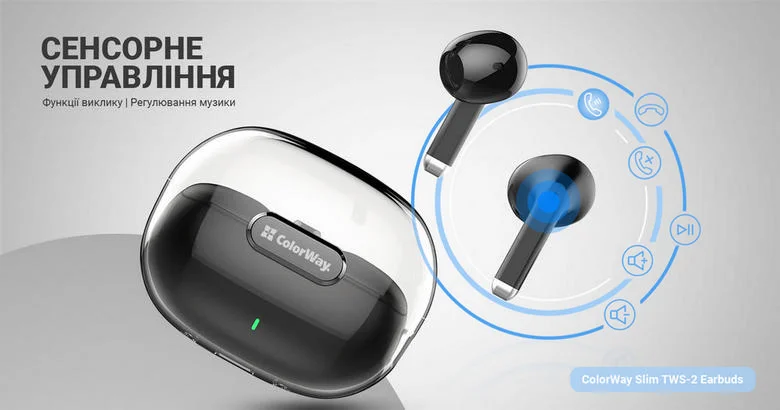 Слухайте музику та приймайте дзвінки з легкістю завдяки інтуїтивно зрозумілому сенсорному управлінню навушниками СolorWay Slim TWS-2 Earbuds. Зручність використання досягається завдяки можливості керування музикою та дзвінками безпосередньо на навушниках.