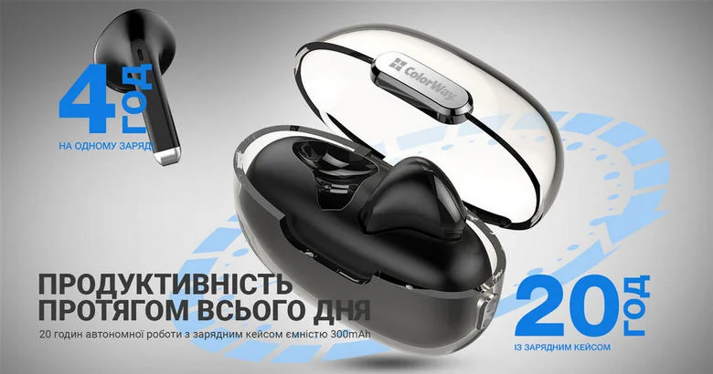 Навушники СolorWay Slim TWS-2 Earbuds забезпечують до 4 годин безперервної роботи на одному заряді. Зарядний кейс ємністю 300mAh дозволяє насолоджуватися автономною роботою до 20 годин, що робить їх ідеальними для тривалих тренувань, вечірок або подорожей.
