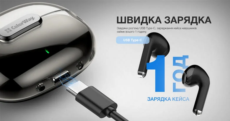 Не гайте часу на очікування - навушники-гарнітура СolorWay Slim TWS-2 Earbuds забезпечують швидке заряджання за допомогою сучасного роз'єму USB Type-C. Усього за 1 годину ви отримаєте повністю заряджений кейс і готовність до прослуховування музики.
