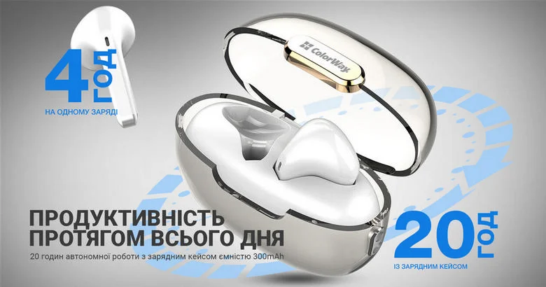 Навушники СolorWay Slim TWS-2 Earbuds забезпечують до 4 годин безперервної роботи на одному заряді. Зарядний кейс ємністю 300mAh дозволяє насолоджуватися автономною роботою до 20 годин, що робить їх ідеальними для тривалих тренувань, вечірок або подорожей.