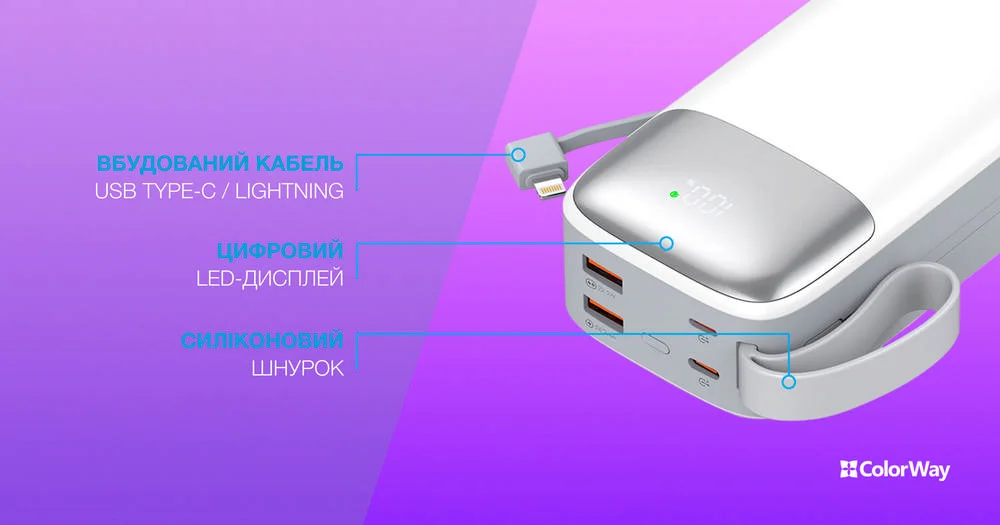 Завдяки інтегрованому дисплею ви зможете легко відслідковувати рівень заряду павербанка. Він має вбудований кабель USB Type-C та Lightning довжиною 15 см, що дозволяє заряджати різні гаджети без зайвих кабелів. Силіконовий шнурок дозволяє прикріпити його до рюкзака чи сумки, забезпечуючи легкий доступ. Ви не втратите його, і він завжди буде під рукою.