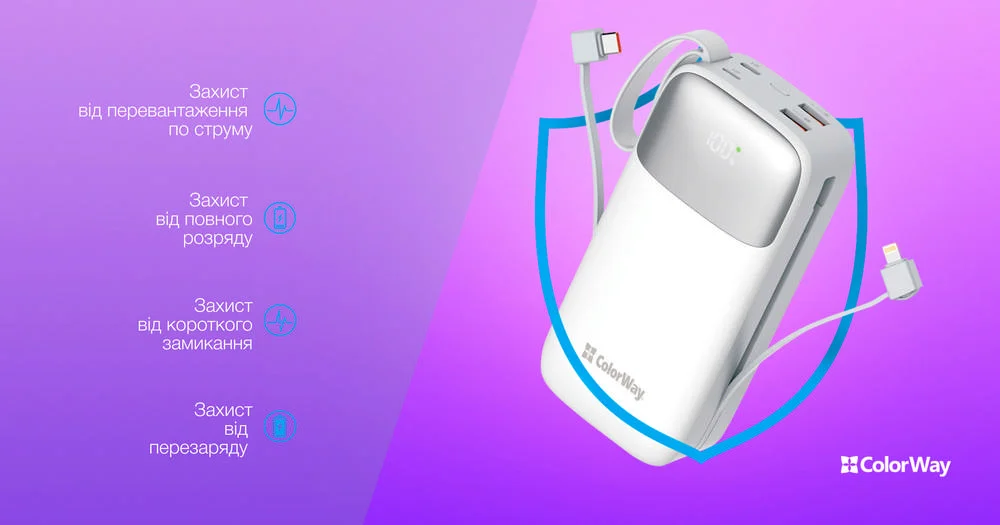 Зовнішній мобільний акумулятор від ColorWay із ємністю 30000mAh представляє собою ідеальне рішення для надійного живлення різноманітних пристроїв. З потужністю до 22.5Вт, він ідеально підходить для заряджання мобільних пристроїв та забезпечення додаткового живлення у випадках відключення електропостачання.