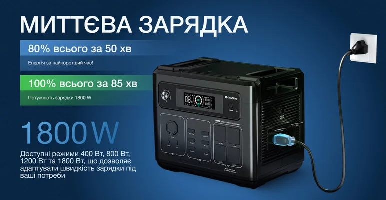 - Швидке заряджання: Станція заряджається до 80% всього за 50 хвилин та 100% за 85 хвилин, при використанні змінного струму потужністю 1800 Вт.
